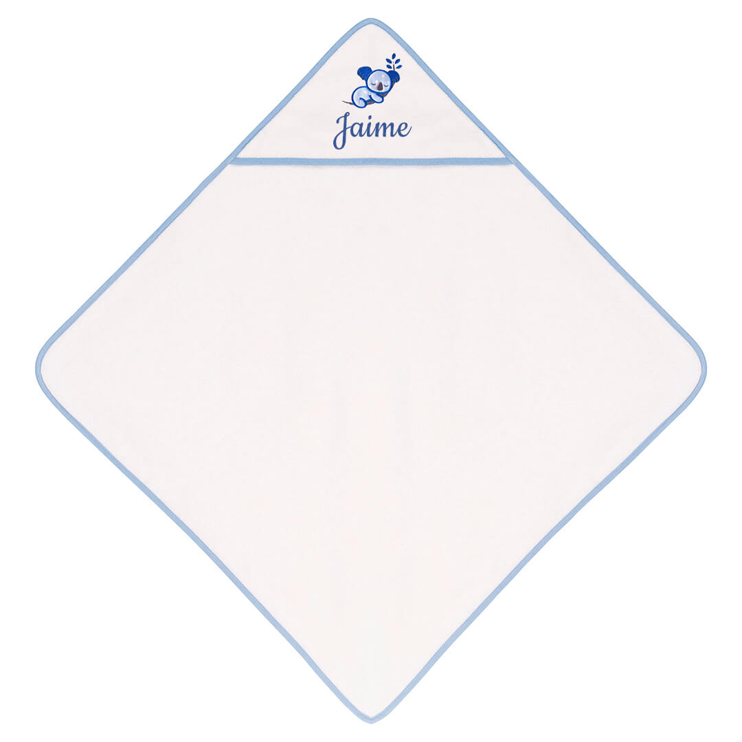 Clásica capa de baño con capucha para bebé, de algodón blanco de alta calidad. Podemos personalizar la capa bordando el nombre del bebé y el dibujo que elijas con el tipo de letra y el color de hilo que quieras.