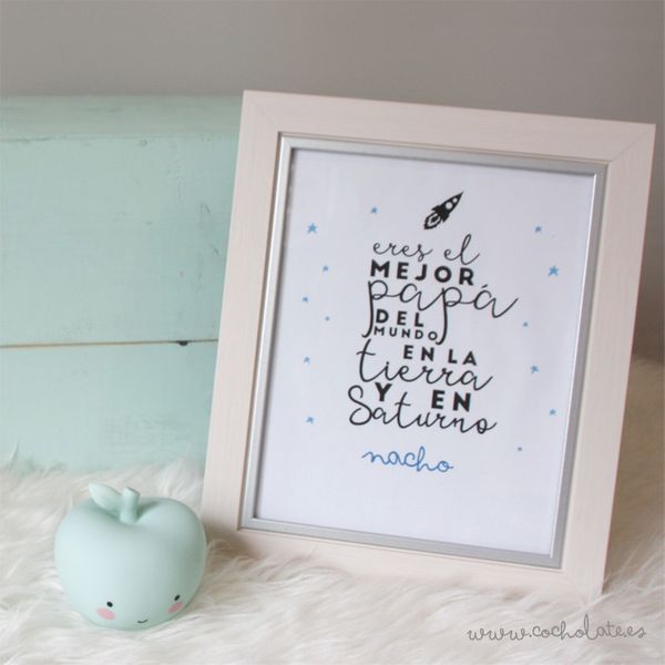 Marco de fotos con pantalla transparente delantera, con el frontal de color marfil, personalizado con una lámina diseñada con el texto «eres el mejor papá/mamá/etc. del mundo en la tierra y en saturno» y con del nombre de los niñ@s.
