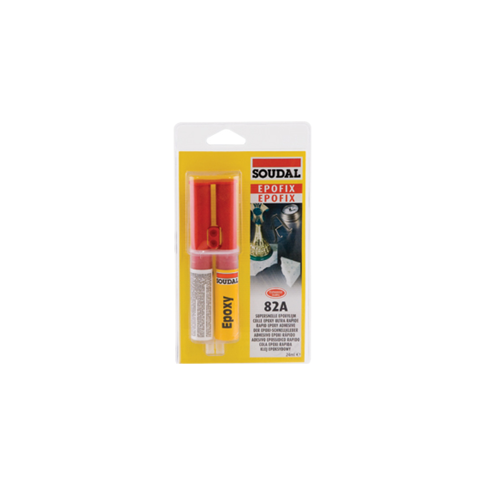 El Pegamento epofix 82A 24ml SOUDAL, es un adhesivo bicomponente de curado rápido a base de resinas epóxicas. Es usado para el pegado de materiales comunes, como porcelana, cerámica, joyas, vidrio, metal, madera, azulejos, etc. Destaca por su secado rápido, su gran fuerza de adherencia, su acumulación rápida de fuerza y su boquilla de aplicación bicomponente. Las superficies a tratar deberán estar limpias, secas y sin polvo ni grasas. Puede almacenarse hasta 12 meses en un lugar seco a unas temperaturas de +5ºC y +25ºC. Tiempo de pegado 10 minutos mínimo. Color transparente. Suministrado en jeringas de 24ml 2K.
